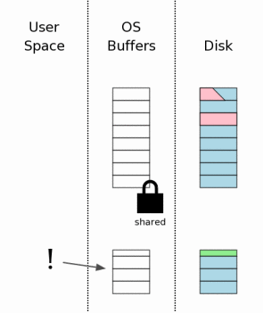 The state of the computer when a database connection is first opened is shown conceptually by the diagram at the right. The area of the diagram on the extreme right (labeled "Disk") represents information stored on the mass storage device. Each rectangle is a sector. The blue color represents that the sectors contain original data. The middle area is the operating systems disk cache. At the onset of our example, the cache is cold and this is represented by leaving the rectangles of the disk cache empty. The left area of the diagram shows the content of memory for the process that is using SQLite. The database connection has just been opened and no information has been read yet, so the user space is empty.